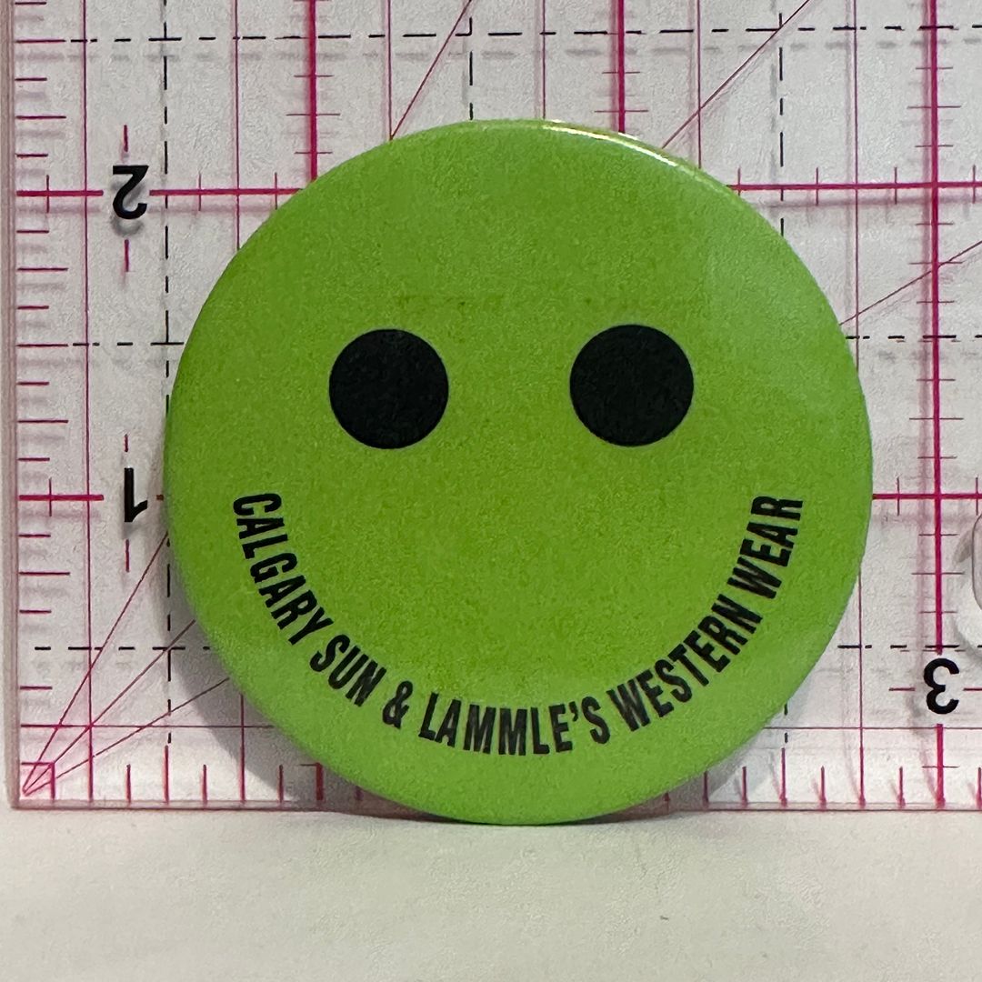 Calgary Sun & Lammle's Western Wear Green Smiling Face Button Pinback