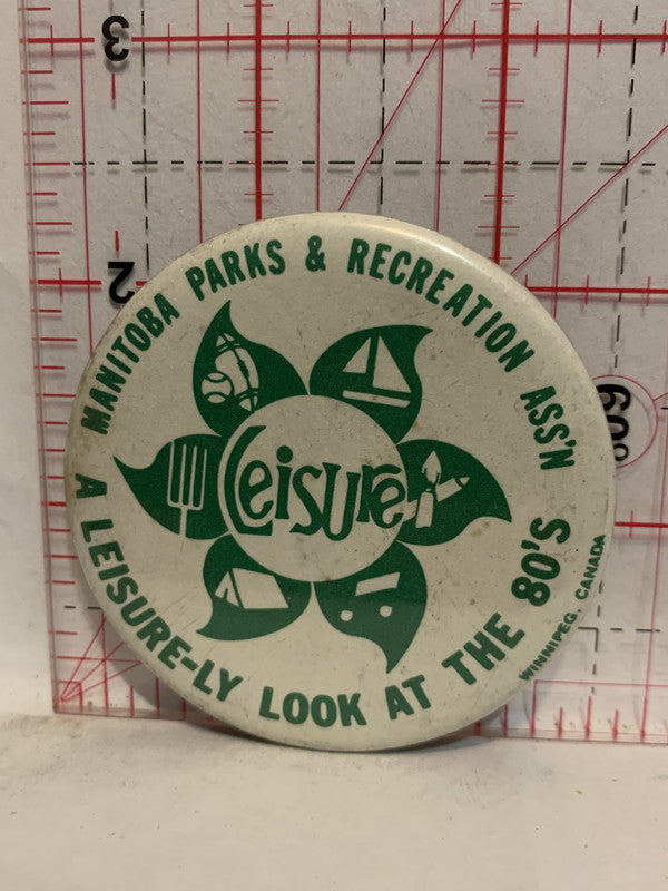 Manitoba Parks & Recreation Ass'n Leisure-ly Look at the 80's Button Pinback