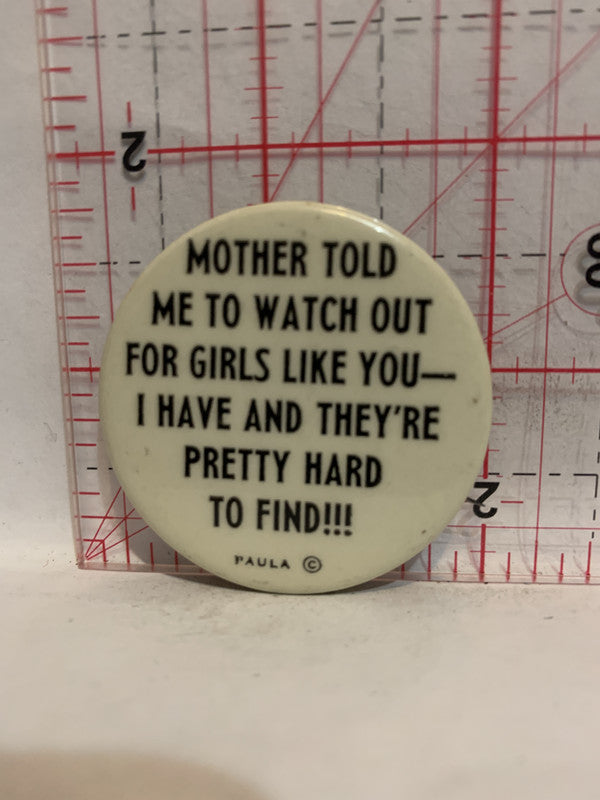 Mother told me to watch out for girls like you Button Pinback