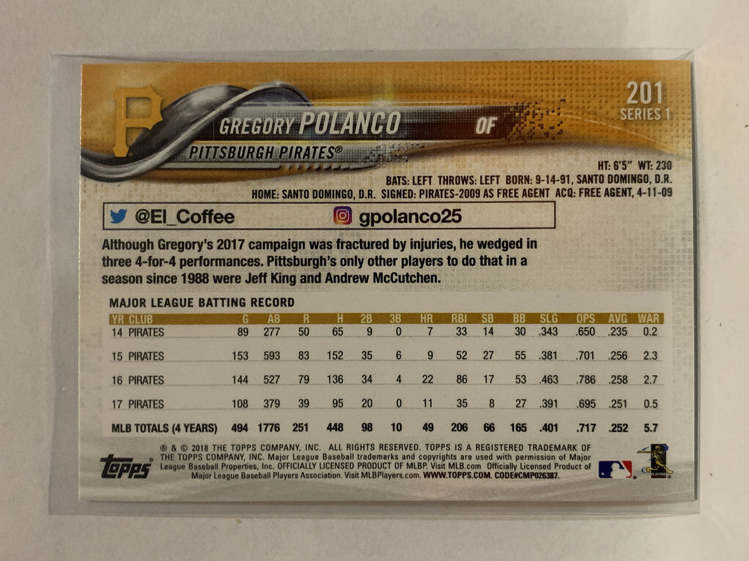 #201 Gregory Polanco Pittsburgh Pirates 2018 Topps Series One Baseball Card MLB