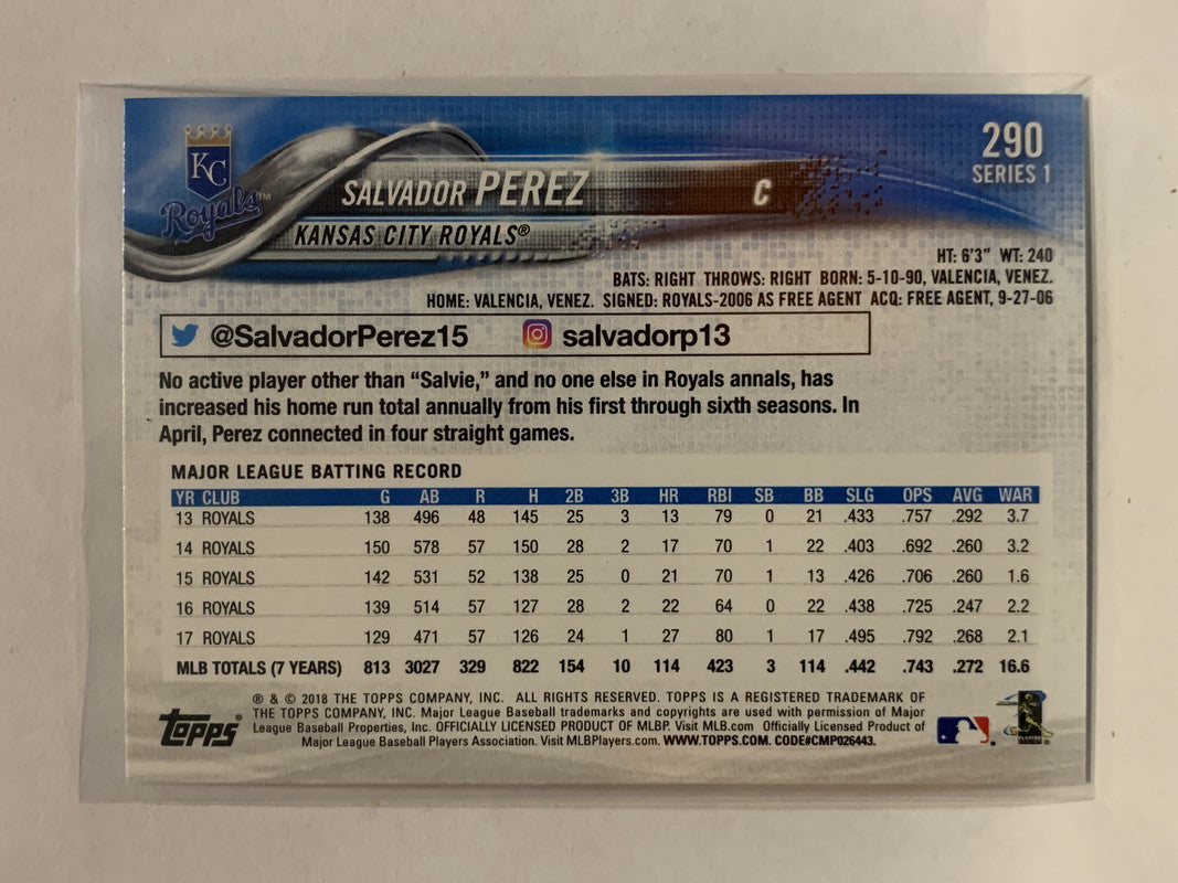 #290 Salvador Perez Kansas City Royals 2018 Topps Series One Baseball Card MLB