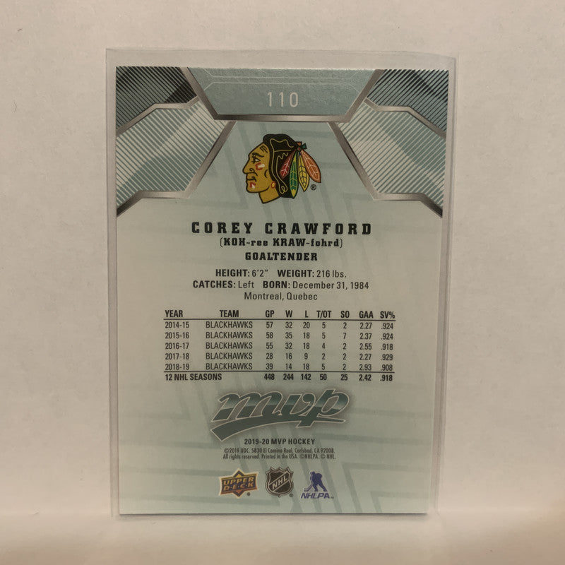 #110 Corey Crawford Chicago Blackhawks 2019-20 Upper Deck MVP Hockey Card KT
