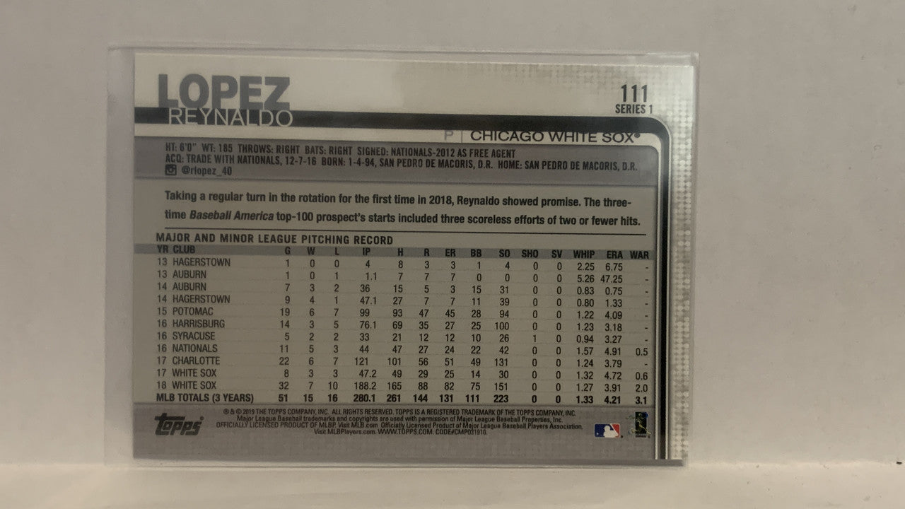 #111 Reynaldo Lopez Chicago White Sox 2019 Topps Series 1 Baseball Card