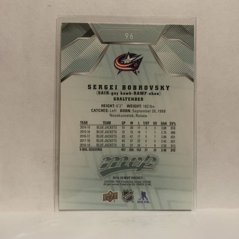 #96 Sergei Bobrovsky Columbus Blue Jackets 2019-20 Upper Deck MVP Hockey Card KQ