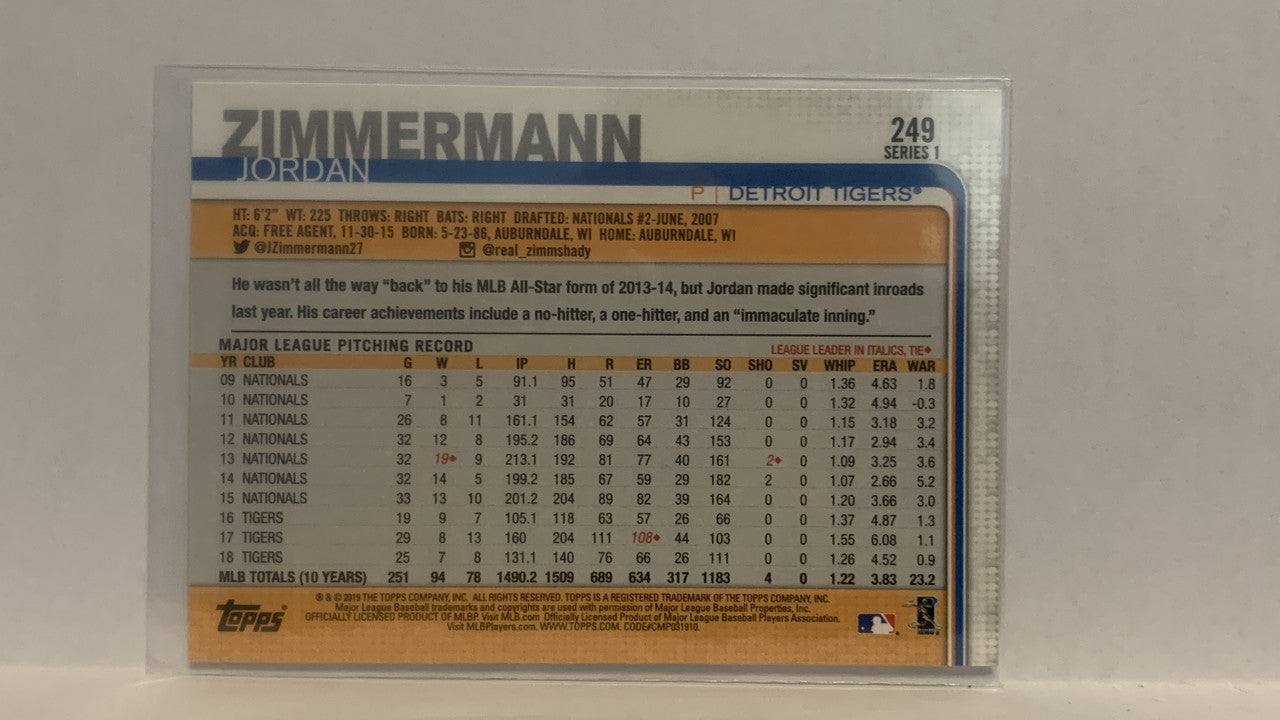 #249 Jordan Zimmermann Detroit Tigers 2019 Topps Series 1 Baseball Card
