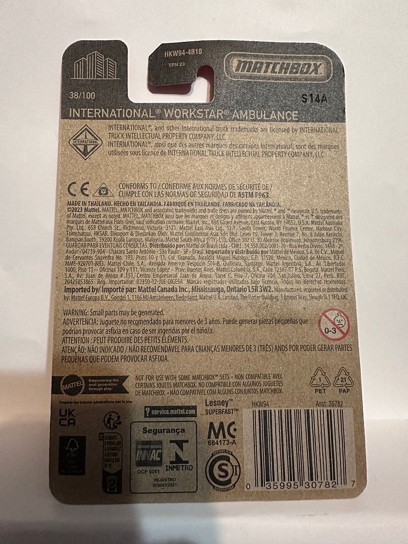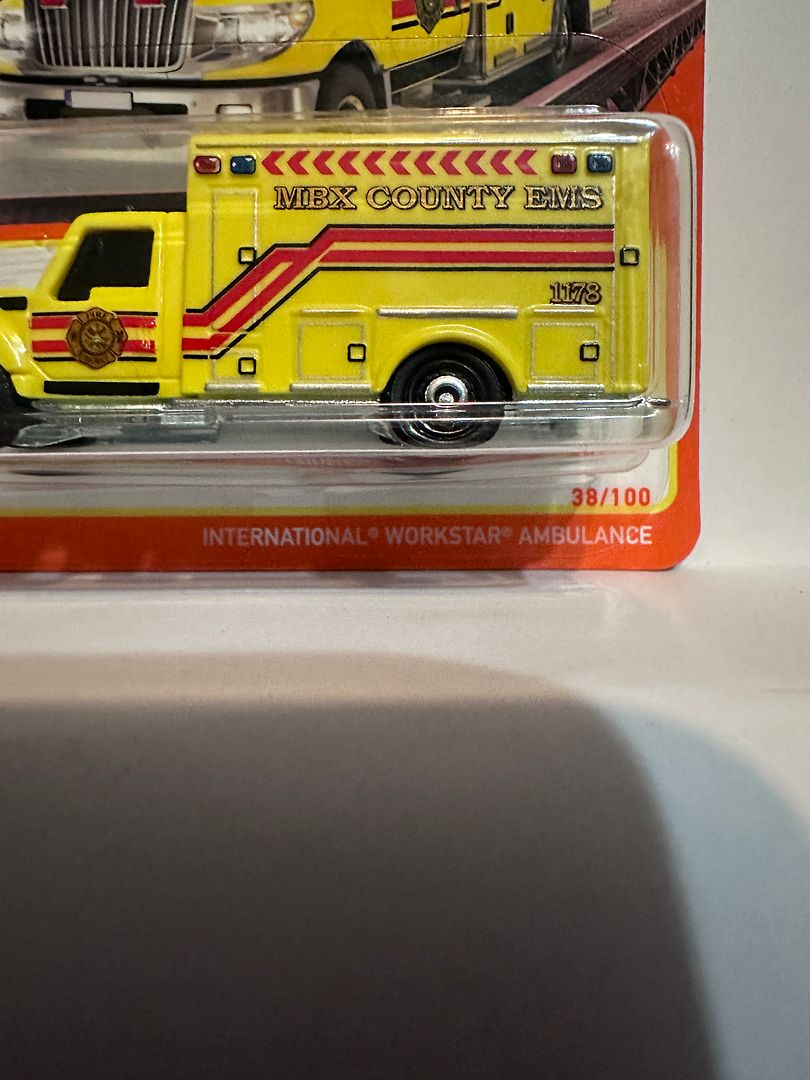Yellow MBX County EMS 70 Years 38/100 International Workstar Ambulance HKW94 ©2023 Matchbox Diecast Car