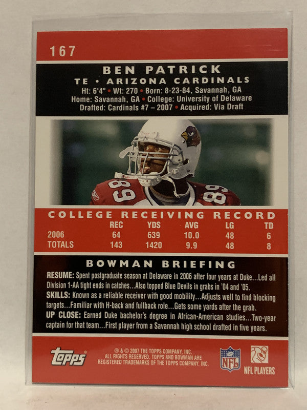 #167 Ben Patrick Rookie Arizona Cardinals 2007 Bowman Football Card NFL