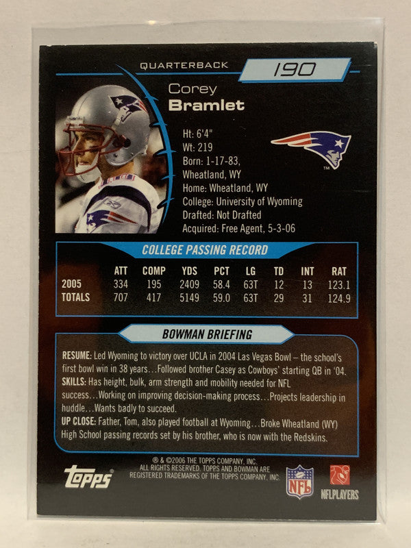 #190 Corey Bramlet Rookie New England Patriots 2006 Bowman Football Card NFL