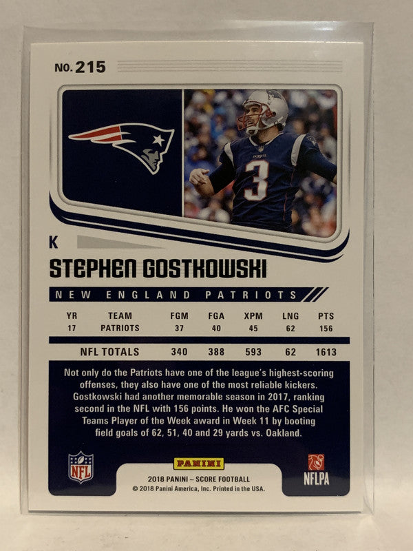 #215 Stephen Gostkowski New England Patriots 2018 Score Football Card