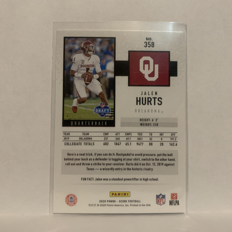 #358 Jalen Hurts Rookie Oklahoma Sooners 2020 Score Football Card LE