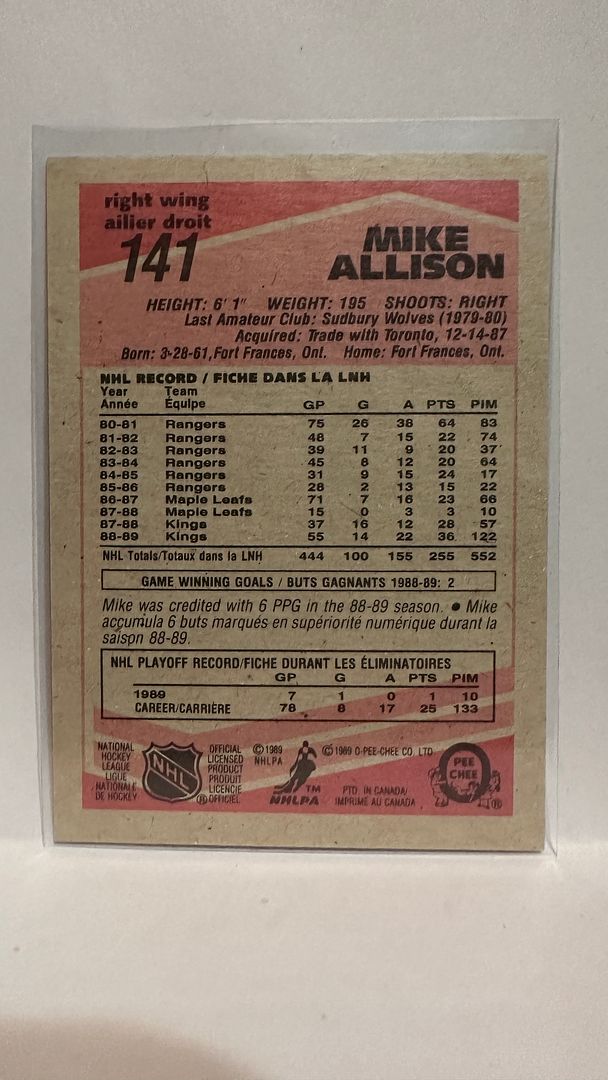 #141 Mike Allison Los Angeles Kings 89-90 O-Pee-Chee Hockey Card