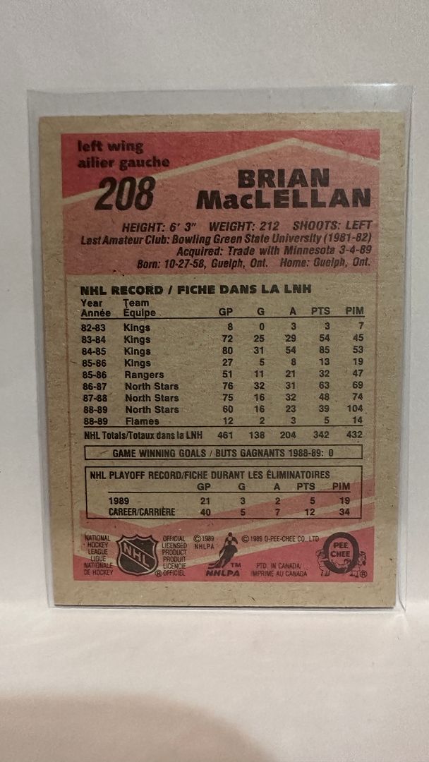 #208 Brian MacLellan Calgary Flames 89-90 O-Pee-Chee Hockey Card