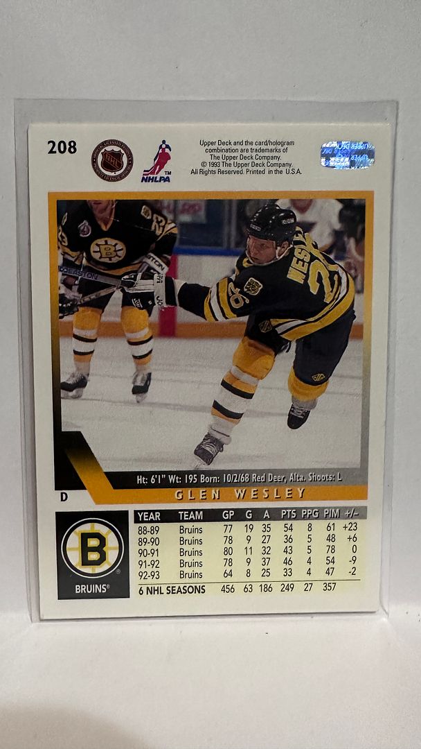 #208 Glen Wesley Boston Bruins 93-94 Upper Deck Hockey Card