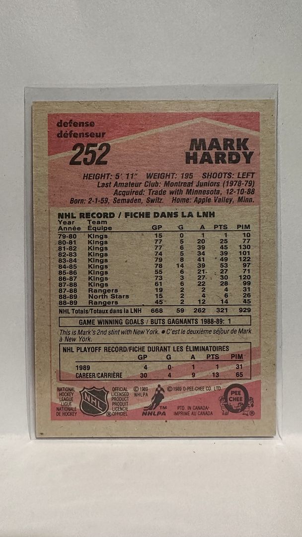 #252 Mark Hardy New York Rangers 89-90 O-Pee-Chee Hockey Card