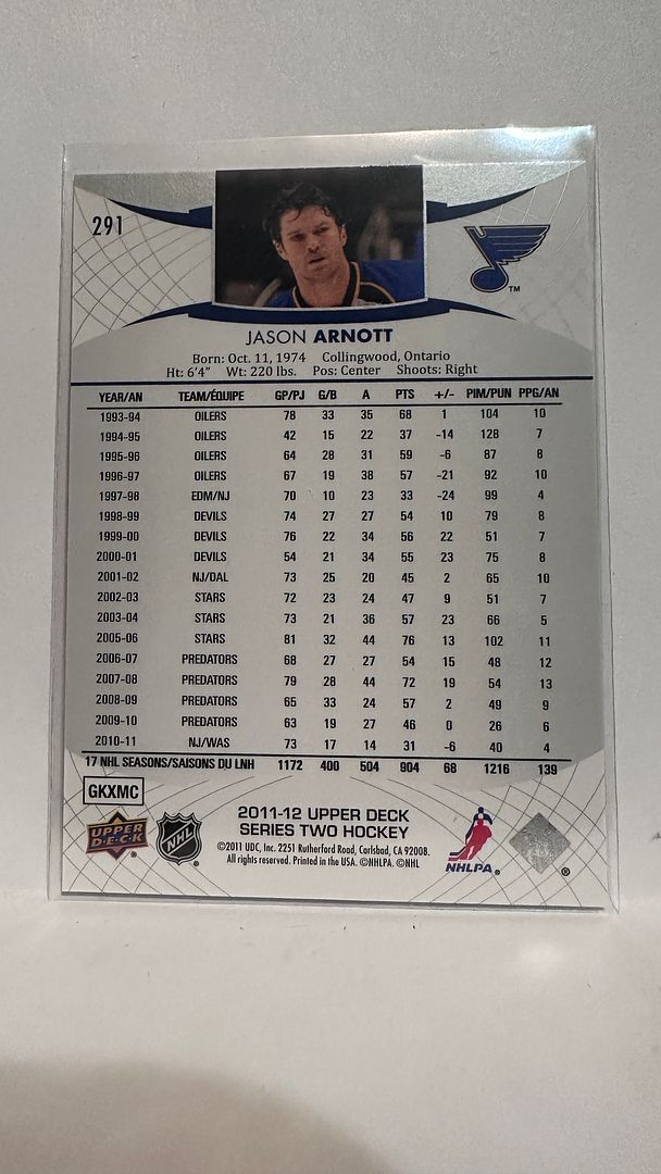 #291 Jason Arnott St Louis Blues 11-12 Upper Deck Series 1 Hockey Card