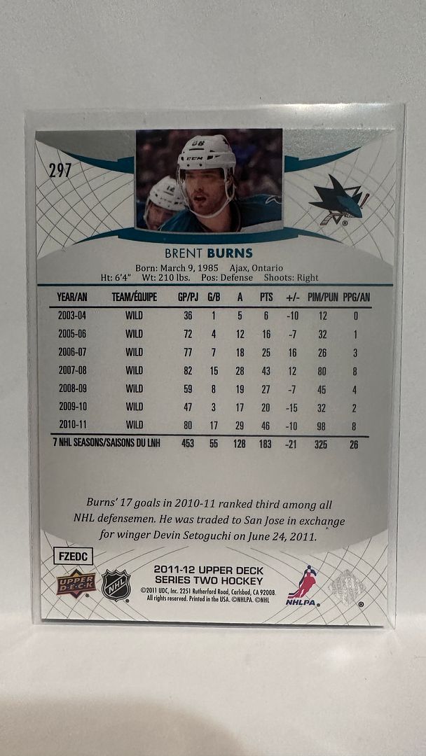 #297 Brent Burns San Jose Sharks 11-12 Upper Deck Series 2 Hockey Card