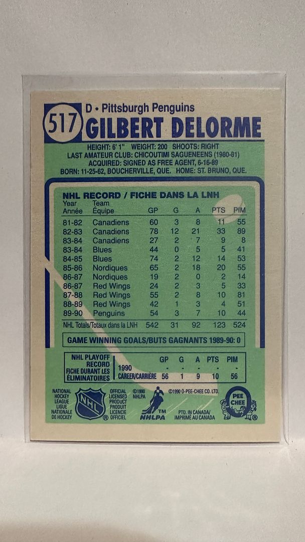 #517 Gilbert Delorme Pittsburgh Penguins 90-91 O-Pee-Chee Hockey Card