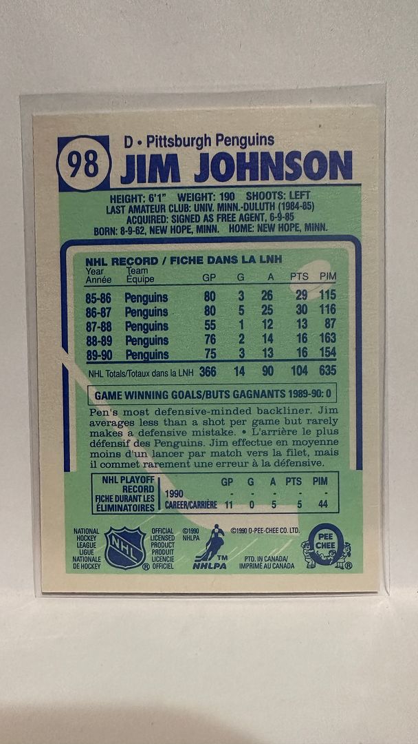 #98 Jim Johnson Pittsburgh Penguins 90-91 O-Pee-Chee Hockey Card