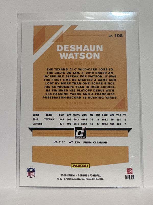#106 Deshaun Watson Houston Texans 2019 Donruss Football Card