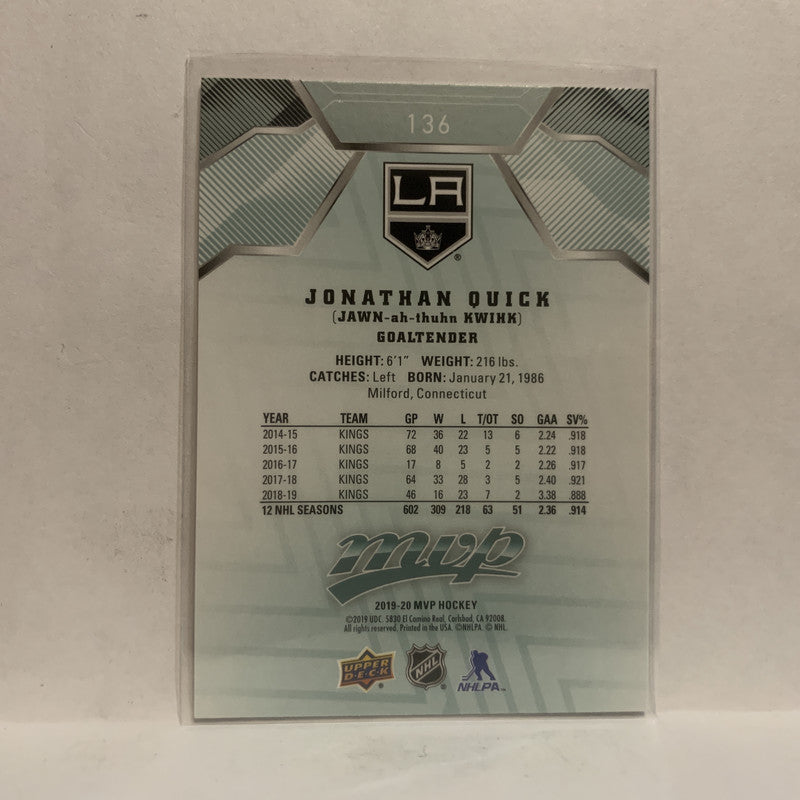#136 Jonathan Quick Los Angeles Kings 2019-20 Upper Deck MVP Hockey Card KT