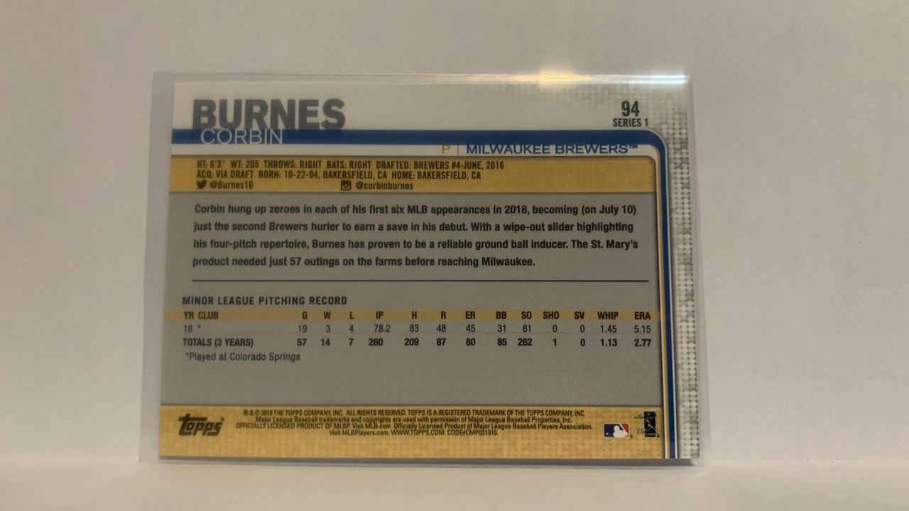 #94 Corbin Burnes Rookie Milwaukee Brewers 2019 Topps Series 1 Baseball Card