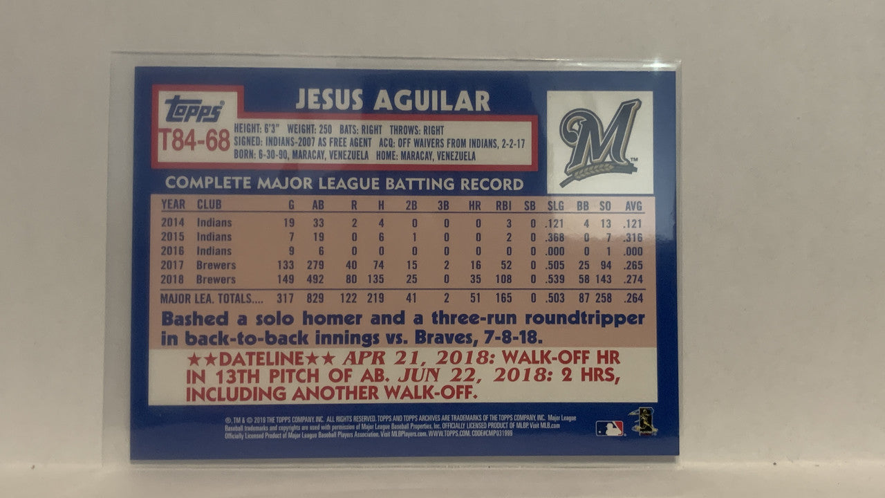 T84-68 Jesus Aguilar Milwaukee Brewers 2019 Topps Series 1 Baseball Card