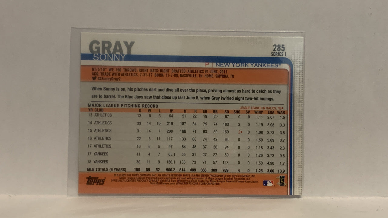 #285 Sonny Gray New York Yankees 2019 Topps Series 1 Baseball Card