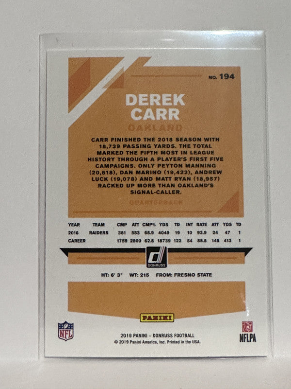 #194 Derek Carr Oakland Raiders 2019 Donruss Football Card