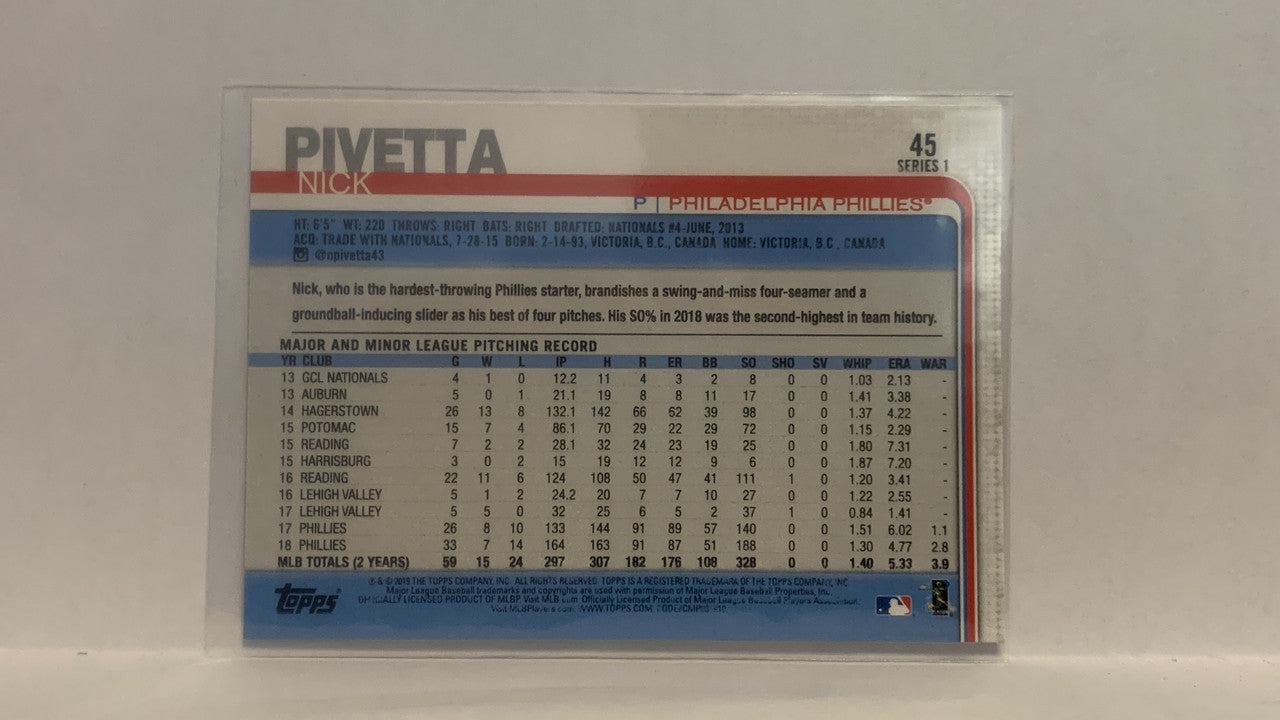 #45 Nick Pivatta Philadelphia Phillies 2019 Topps Series 1 Baseball Card
