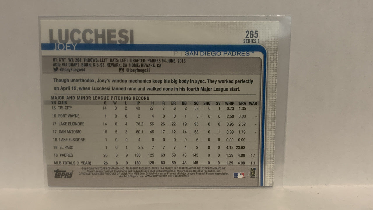 #265 Joey Lucchesi Future Stars San Diego Padres 2019 Topps Series 1 Baseball Card