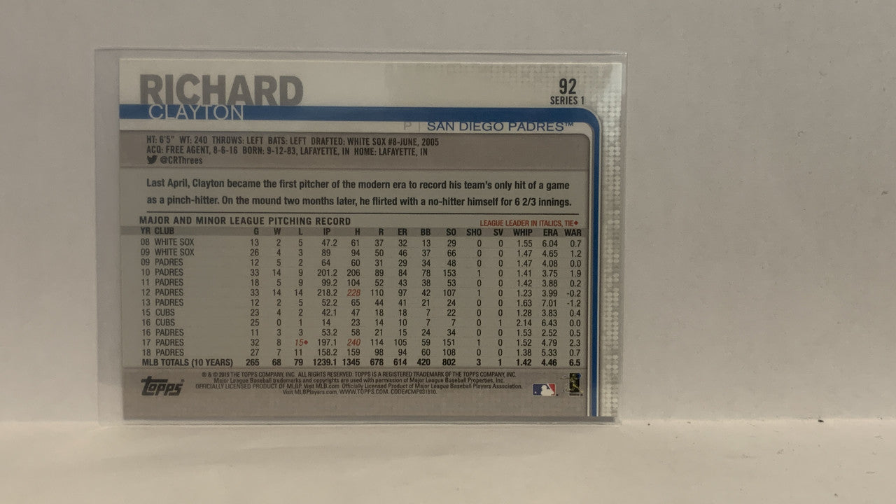 #92 Clayton Richard San Diego Padres 2019 Topps Series 1 Baseball Card