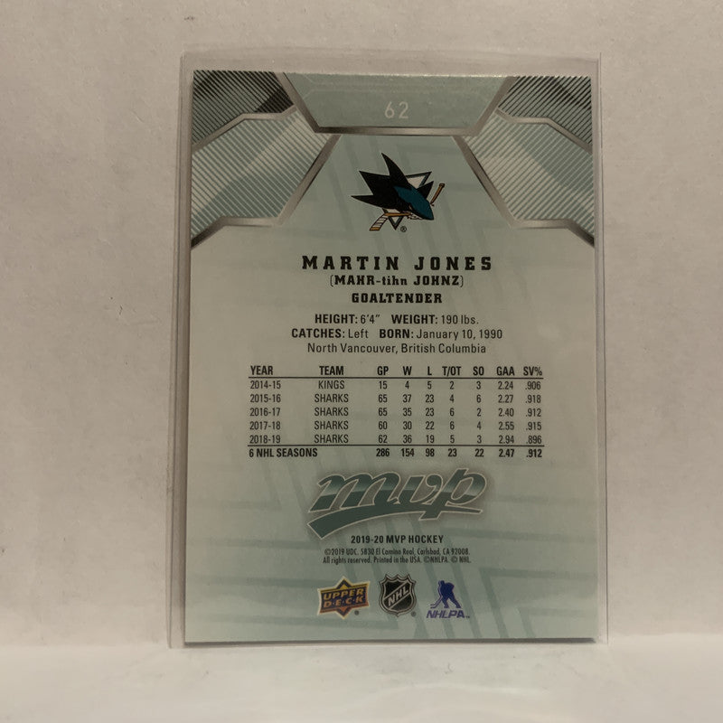 #62 Martin Jones San Jose Sharks 2019-20 Upper Deck MVP Hockey Card LI