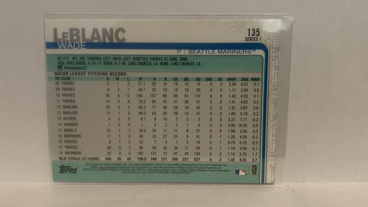 #135 Wade Leblanc Seattle Mariners 2019 Topps Series 1 Baseball Card