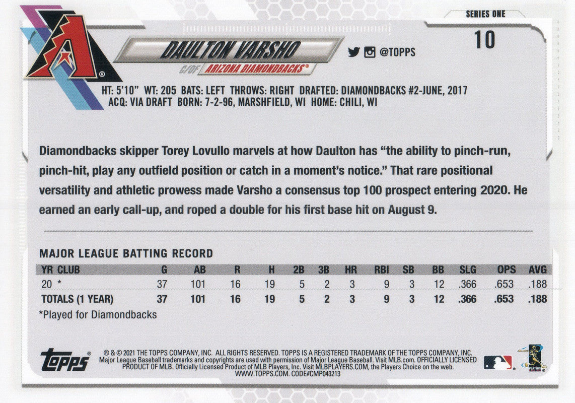 #10 Daulton Varsho Rookie Arizona Diamondbacks 2021 Topps Series 1 Baseball Card