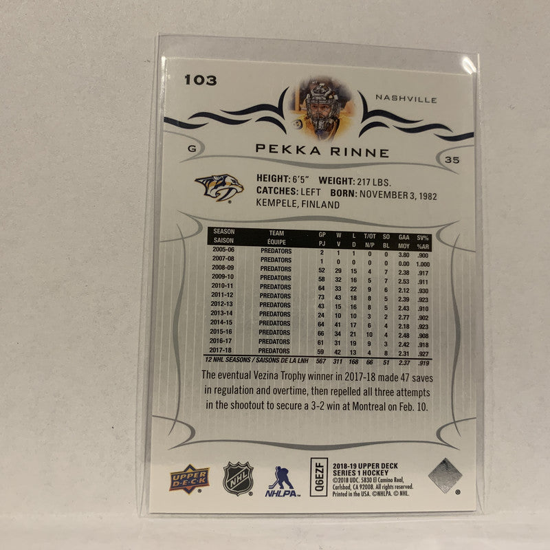 #103 Pekka Rinne Nashville Predators Series 1 2018-19 Upper Deck Hockey Card A2Y