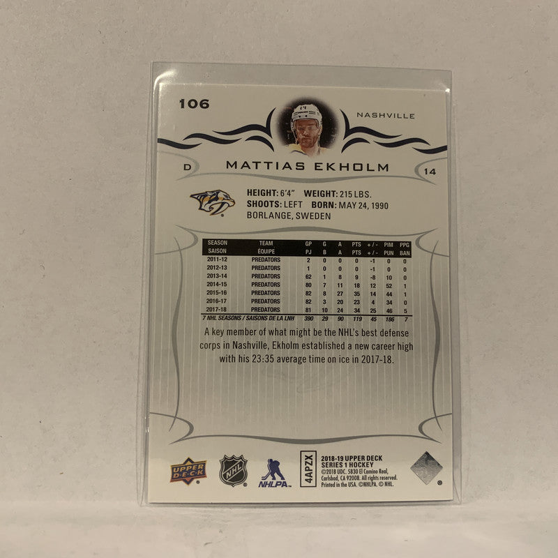 #106 Mattias Ekholm Nashville Predators Series 1 2018-19 Upper Deck Hockey Card A2L