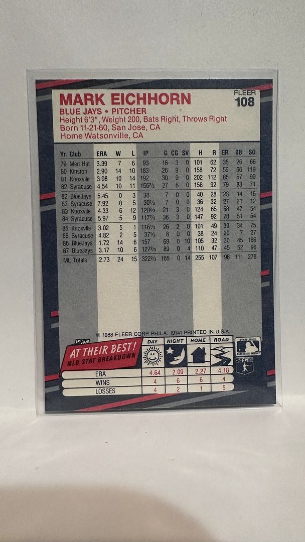 #108 Mark Eichhorn Toronto Blue Jays 1988 Fleer Baseball Card