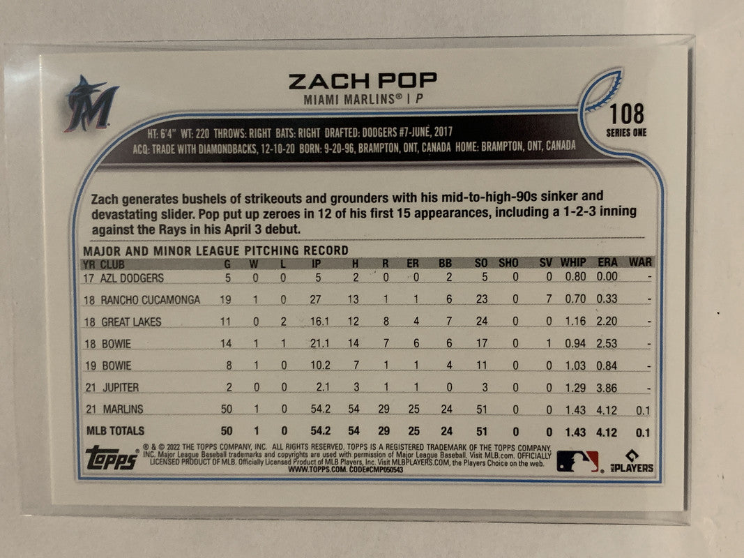 #108 Zach Pop Rookie Miami Marlins 2022 Topps Series 1 Baseball Card MLB