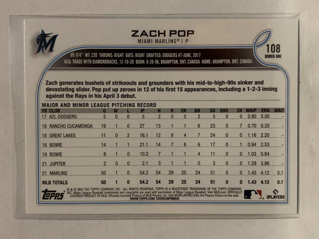 #108 Zach Pop Rookie Miami Marlins 2022 Topps Series One Baseball Card MLB