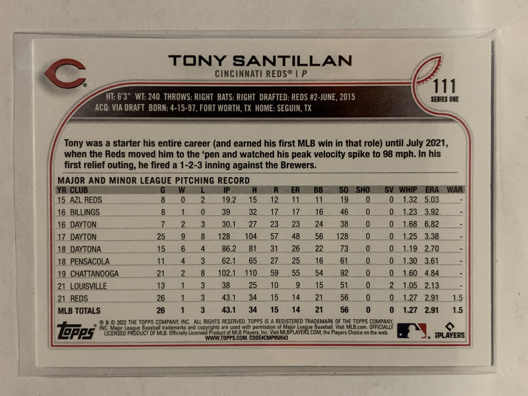 #111 Tony Santillan Rookie Cincinnati Reds 2022 Topps Series One Baseball Card MLB