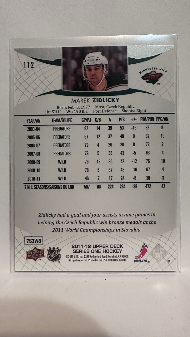 #112 Marek Zidlicky Minnesota Wild 11-12 Upper Deck Series 1 Hockey Card