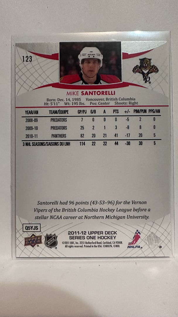 #123 Mike Santorelli Florida Panthers 11-12 Upper Deck Series 1 Hockey Card
