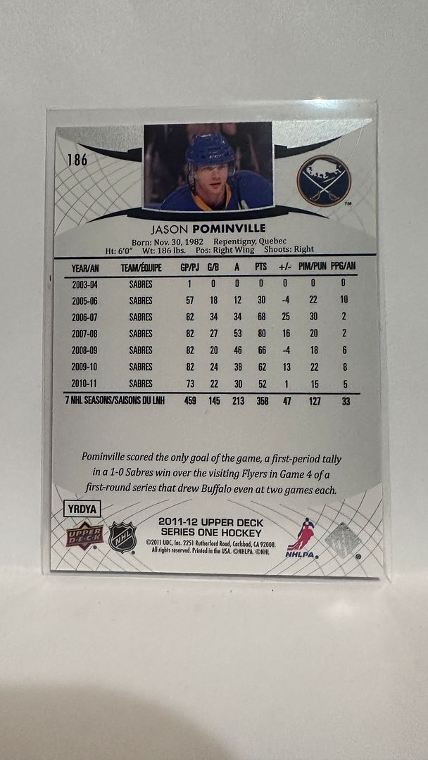 #186 Jason Pominville Buffalo Sabres 11-12 Upper Deck Series 1 Hockey Card