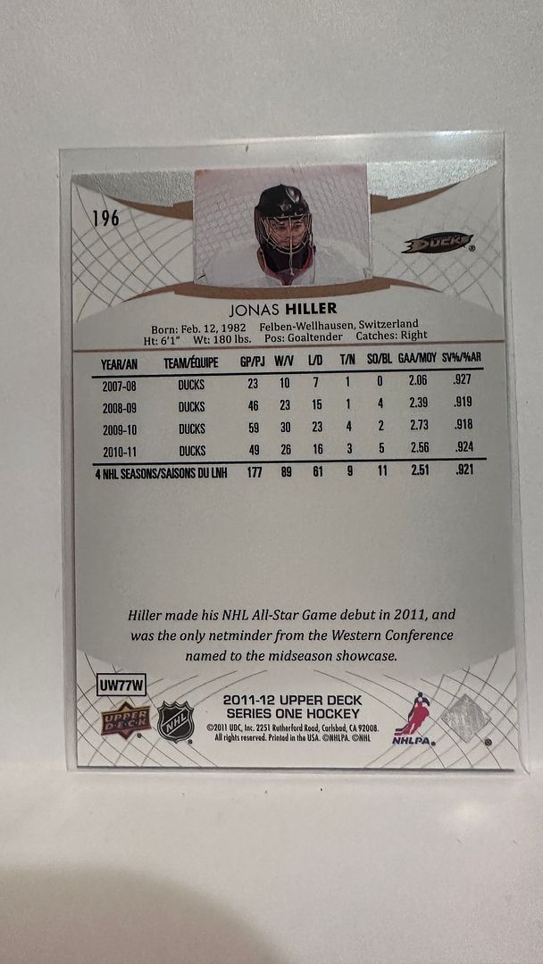 #196 Jonas Hiller Anaheim Ducks 11-12 Upper Deck Series 1 Hockey Card