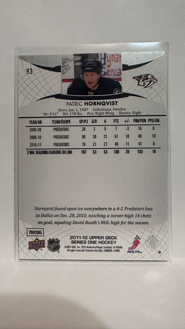 #93 Patric Hornqvist Nashville Predators 11-12 Upper Deck Series 1 Hockey Card