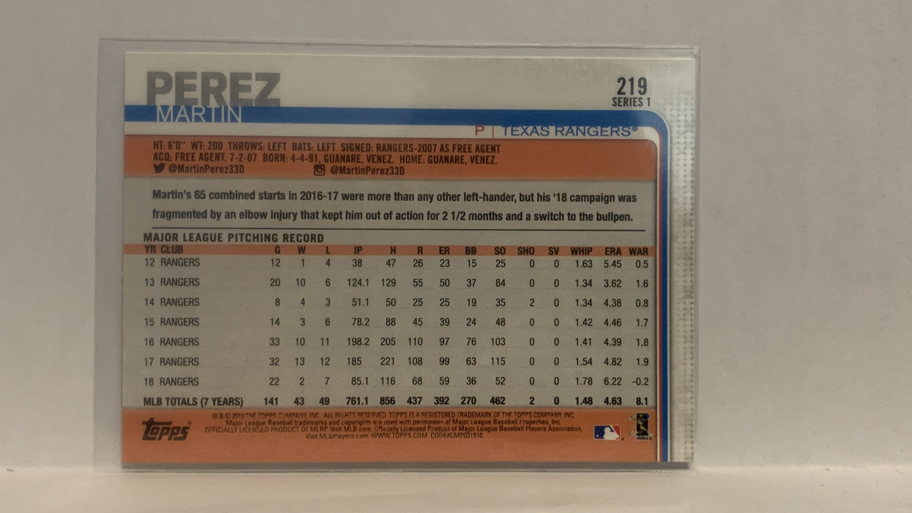 #219 Martin Perez Texas Rangers 2019 Topps Series 1 Baseball Card