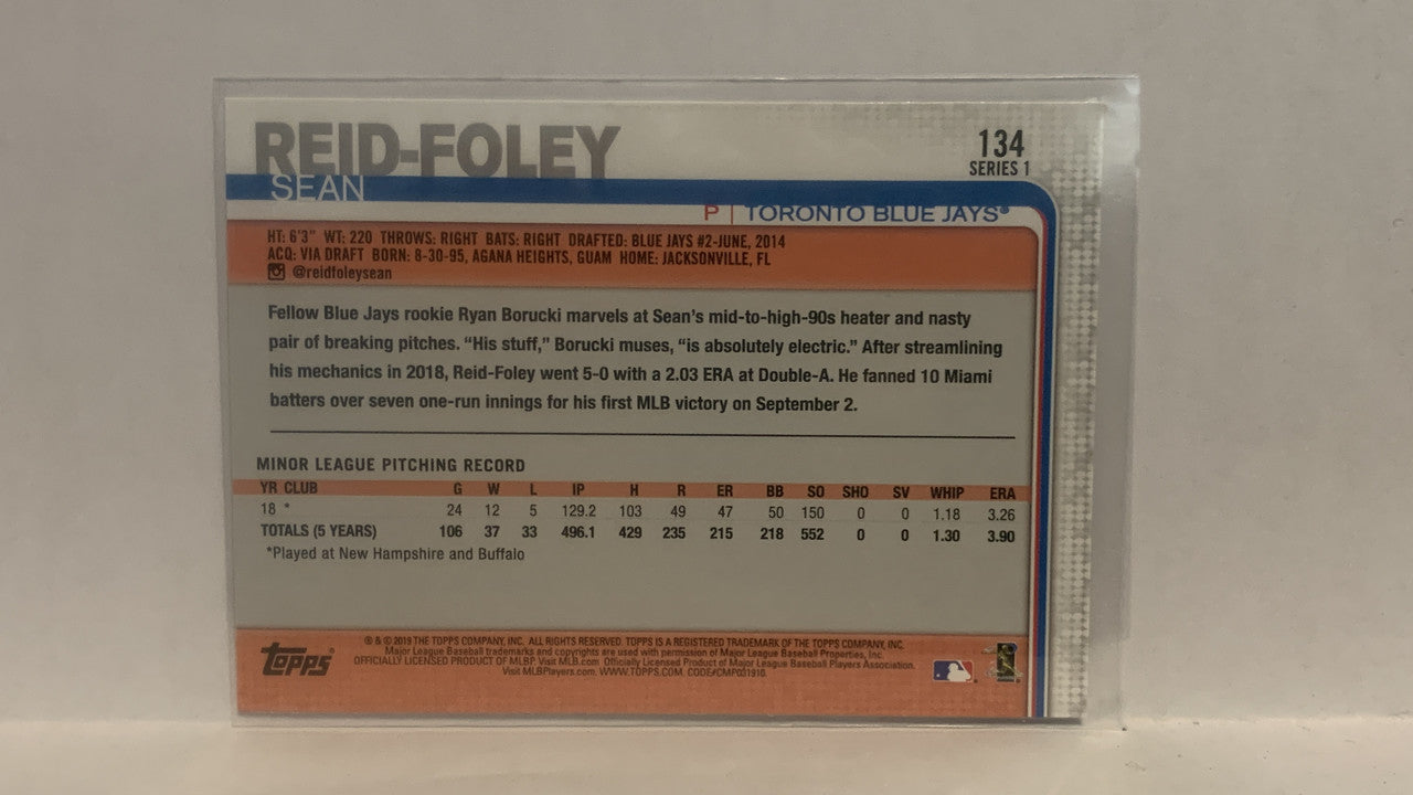#134 Sean Reid-Foley Rookie Toronto Blue Jays 2019 Topps Series 1 Baseball Card