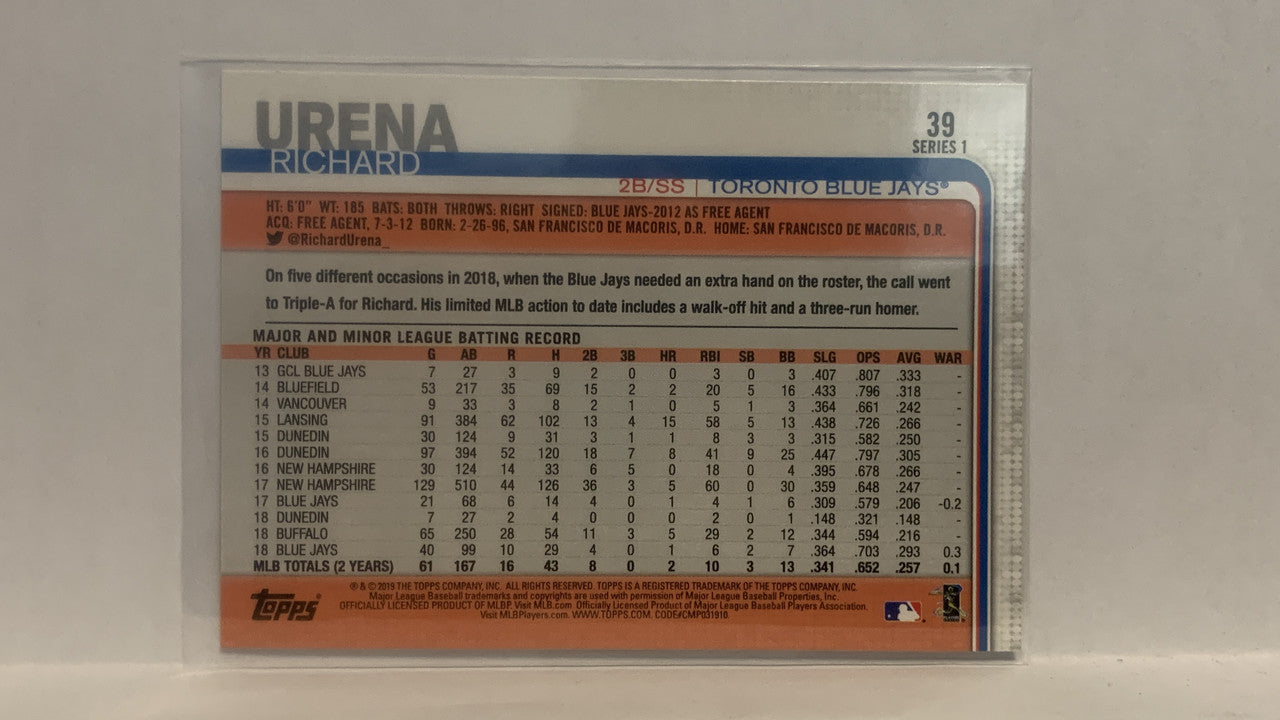 #39 Richard Urena Toronto Blue Jays 2019 Topps Series 1 Baseball Card