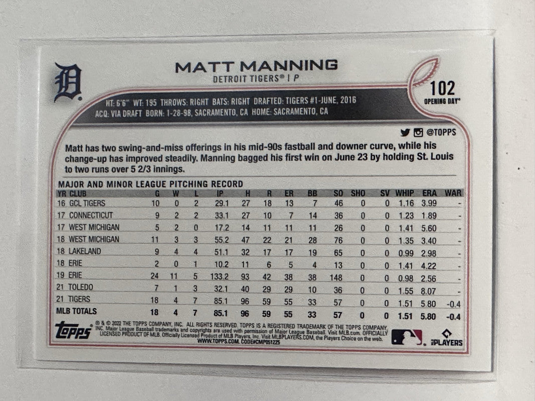 #102 Matt Manning Rookie Detroit Tigers 2022 Topps Opening Day Baseball Card