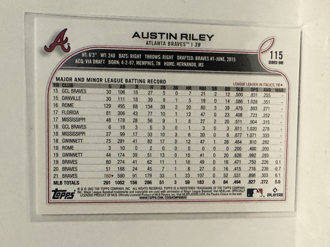 #115 Austin Riley Atlanta Braves 2022 Topps Series One Baseball Card